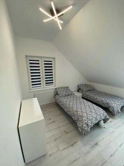 Domek. Featuring a private entrance, this spacious chalet also consists of 1 living room, 3 separate bedrooms and 1 bathroom with a shower. Guests will find a stovetop, a refrigerator, kitchenware and a microwave in the well-equipped kitchenette. The chalet also offers a barbecue. Boasting a terrace with garden views, this chalet also provides a tea and coffee maker and a flat-screen TV with cable channels. The unit offers 6 beds. Domek - 7 osobowy. Powierzchnia pokoju ok.: 80 mkw.